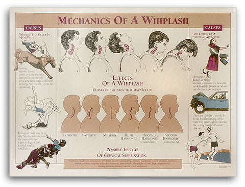 This is the ultimate poster for explaining how a proper spinal C curve can be altered by whiplash. This graphic tool makes the point that whiplash is an injury induced by head whipping. It is not only caused by auto accidents but can also be provoked by many different types of incidents. Great for D.C. structural corrective techniques like CBP Pettibon, Gonstead, etc…