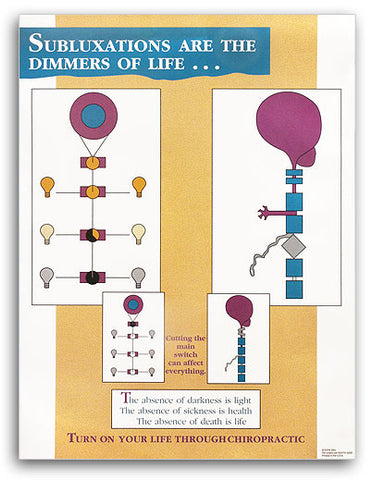 The excellent analogy depicted on this poster shows how subluxations are like dimmer switches. Explain to patients that they have to choose whether they want their body to function like a bright light that is receiving full power, or a dim light that only receives a limited amount of energy. This poster also illustrates how the upper cervicals can affect anything and everything below them.