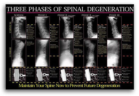 Three Phases of Spinal Degeneration is a popular poster creating a clear understanding of this problem by comparing the degenerating spine to an automobile wheel out of alignment. This is a clear and effective analogy for helping patients understand the importance of spinal maintenance.
